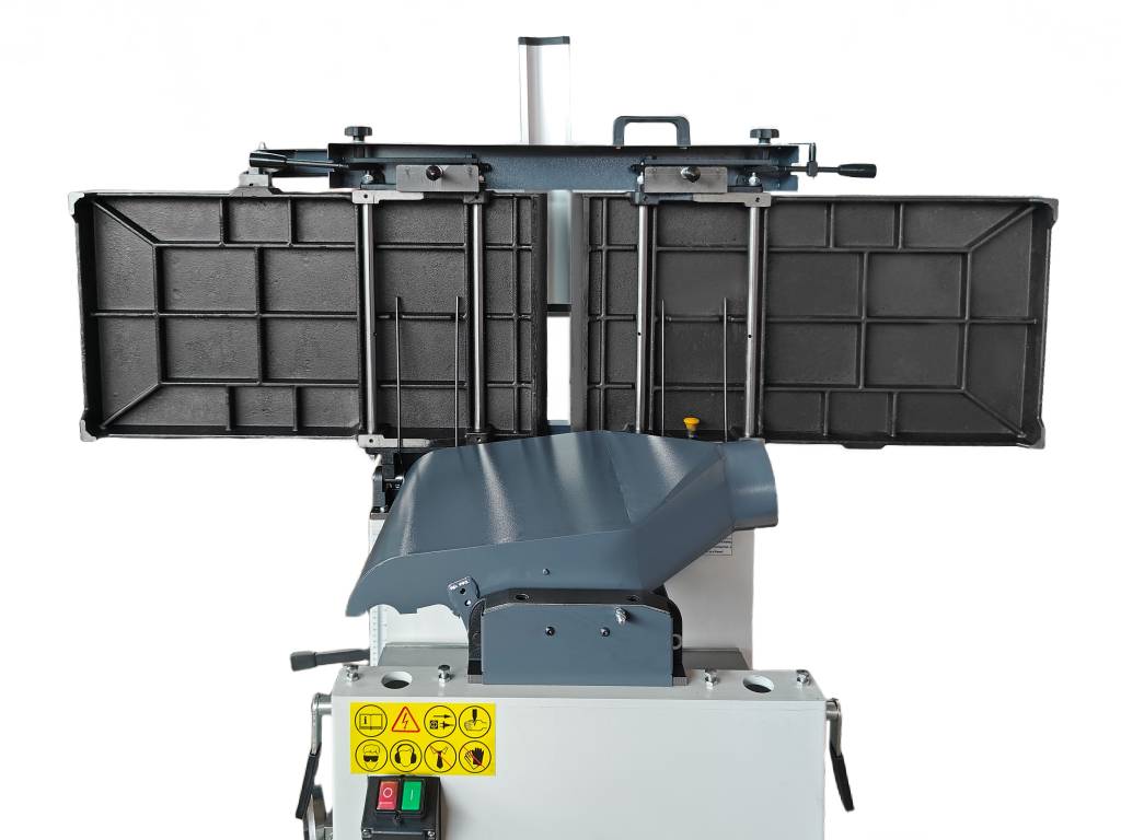 - Станок оснащён эксцентриковым механизмом, который позволяет удобно регулировать положение подающего и отводящего столов;