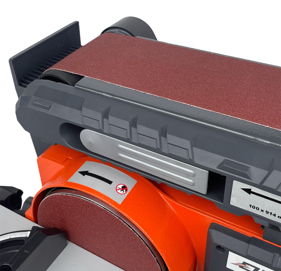 - На ленточном шлифовальном узле в качестве шлифовального инструмента применяют бесконечную абразивную шлифовальную ленту, натянутую на двух барабанах. На дисковом шлифовальном узле в качестве шлифовального инструмента применяют наклеенный на прижимной диск абразивный шлифовальный лист Ø150 мм.