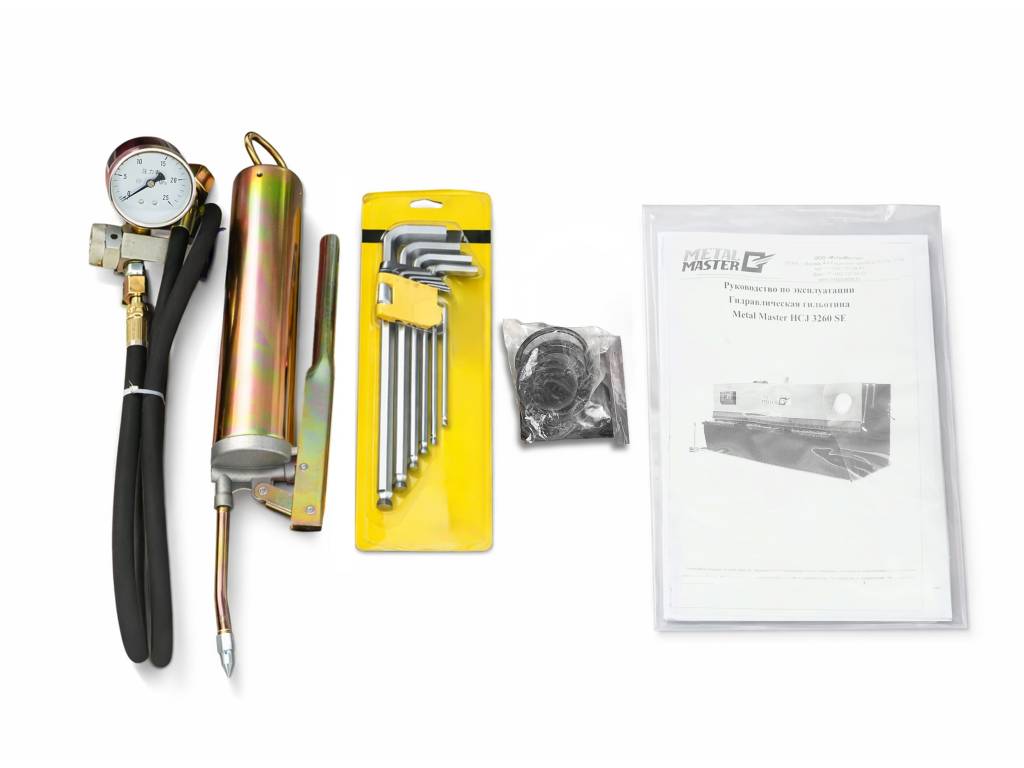 В стандартную комплектацию гильотины Metal Master HCJ 3280 SE также входят набор прокладок и уплотнительных колец, смазочный шприц, специальное устройство для заправки пневмоцилиндров, руководство по эксплуатации на русском языке.СТАНДАРТНАЯ КОМПЛЕКТАЦИЯ ГИЛЬОТИНЫ METAL MASTER HCJ 3280 SE Контроллер E21 S (Estun) Двигатель SITEJIE Клапаны SHANGHAI TIANHAN Электрика DELIXI/CHNT Масляный насос FIRST Инструмент Верхний нож с двумя режущими кромками и нижний нож с четырьмя режущими кромками Зазор между ножами Ручная регулировка Прижим заготовки Гидравлический Педаль управления Выносная Руководство по эксплуатации На русском языке