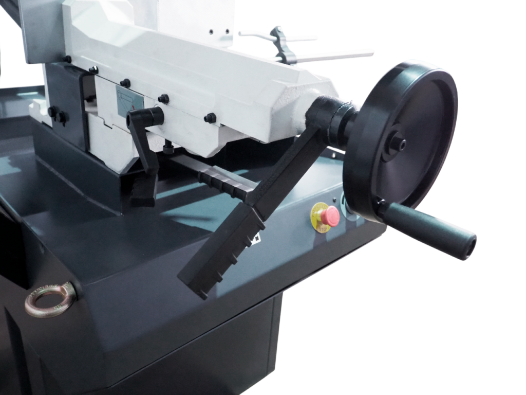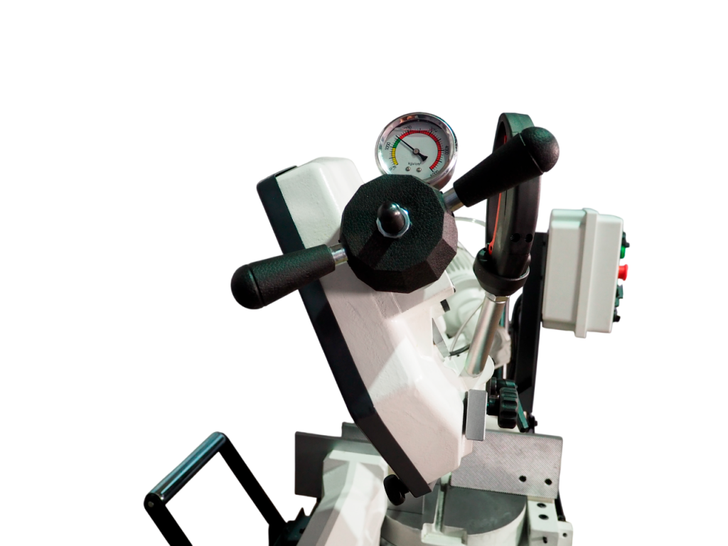 Натяжение ленточнопильного полотна осуществляется маховиком c тензометром, что позволяет контролировать натяжение полотна и тем самым получать стабильный рез и продлить срок службы полотна.