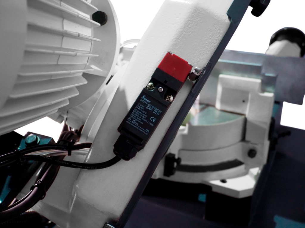Крышка шкивов оснащена защитным концевым выключателем, при срабатывании которого станок выключается, и пильное полотно останавливается.
