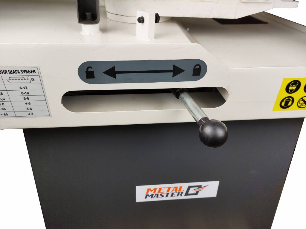 Перпендикулярное положение полотна обеспечивается за счёт направляющих. Вылет можно изменять под размеры заготовки.