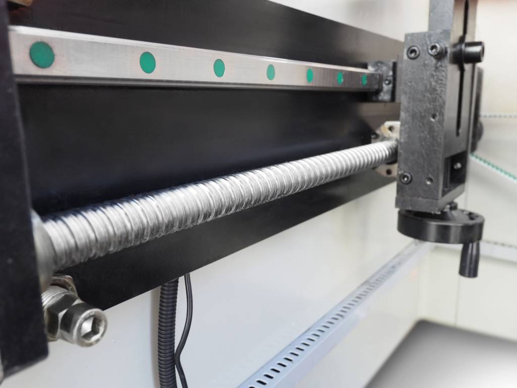 Станок оснащен двухосевым ЧПУ E22 с сенсорным экраном. Управление по оси Y осуществляется ЧПУ путем задания положения механического упора, находящегося в гидроцилиндре. Это обеспечивает высокую точность и стабильность результата. Управление по оси X также осуществляется ЧПУ, за что отвечает привод на базе мотор-редуктора и высокоточной ШВП с направляющими и датчиком обратной связи.
