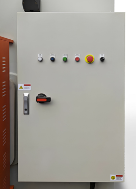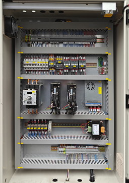 Электро-шкаф служит для безопасного размещения электрокомпонентов станка. В листогибочных прессах серии PressMaster PRO 4+1 используются электрокомпоненты компании Schneider Electric. | На самом шкафу расположены индикатор включения, аварийные индикаторы, которые предупреждают об ошибке в работе гидравлической станции, тумблер включения и выключения подсветки, и общий рубильник вкл/выкл подачи электропитания. |