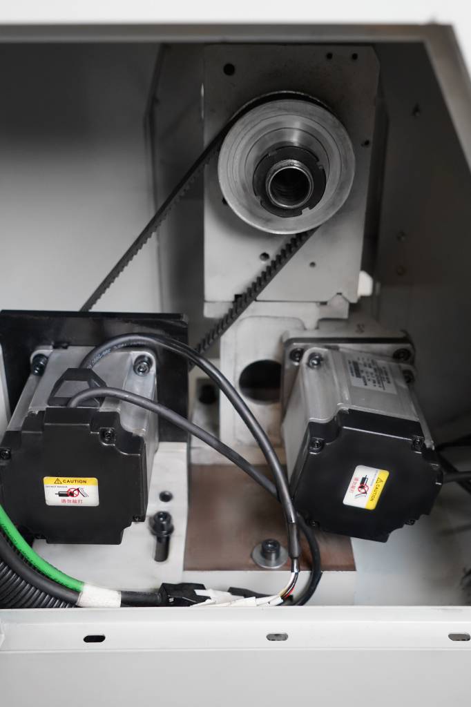 Станок оснащен надежным серводвигателем мощностью 0,75 кВт. Вращение на шпиндель передается через клиновый ремень.