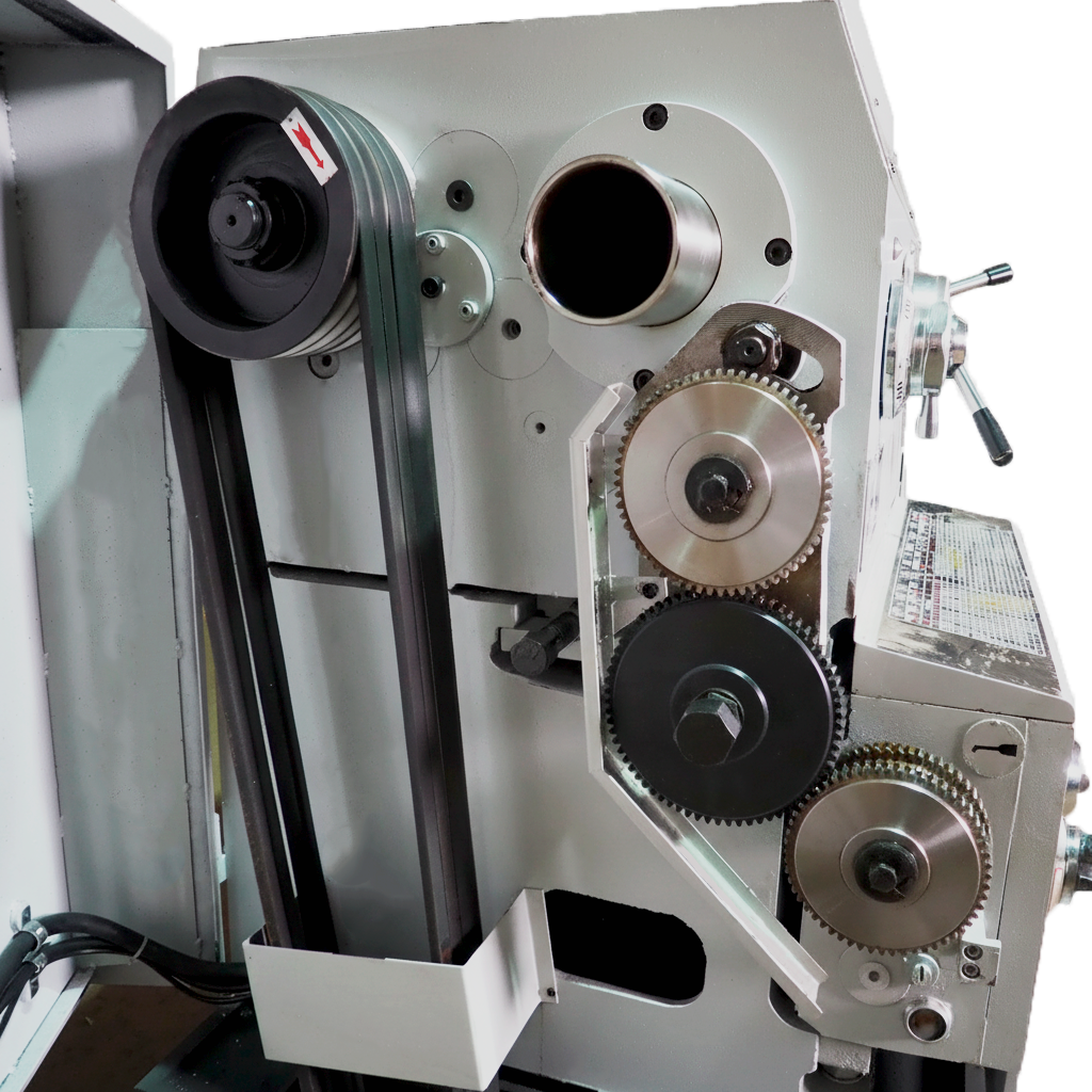 Модель обладает удобной эргономикой управления, понятной любому токарю. Под защитной крышкой шпиндельной бабки расположены приводные шкивы и гитара зубчатых колес.