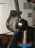 На станке предусмотрено выталкивание патрона. Предохранительная скоба отводится в сторону, а шпиндель поднимается вверх до упора.