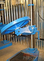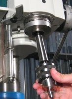 На станке предусмотрено выталкивание патрона. Для этого предохранительная скоба отводится в сторону, а шпиндель поднимается вверх до упора.