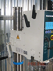 Вращение шпинделя меняется при переключении ручкой панели управления. Там же находится регулируемый механический упор глубины сверления. Головка перемещается по колонне опоры при помощи зубчатой передачи вручную.