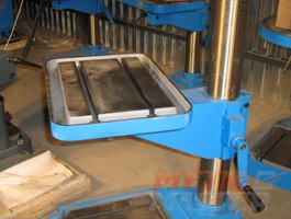Обрабатываемая заготовка закрепляется на станке при помощи литого прямоугольного стола с параллельными Т-пазами. Зубчатый механизм перемещает стол вдоль колонны опоры. Рабочий стол станка может поворачиваться вокруг вертикальной оси. При работе с заготовками больших размеров стол отводят в сторону и закрепляют детали на опорной плите в виде прямоугольного стола с пазами в форме Т.