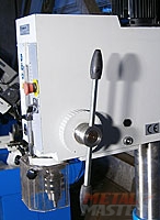 На высокоточных подшипников установлен закаленный шлифованный шпиндель, также он укрыт защитным щитком. Передача крутящего момента на шпиндель осуществляется посредством шестереночного редуктора. Переключение скоростей осуществляется посредством поворота ручек на сверлильной головке. Таблица соответствия положения ручек и скоростей вращения шпинделя расположена на боковой части сверлильной головки. На панели управления расположен механический ограничитель глубины сверления, кнопки пуска и аварийного останова, а также переключатель на автоматическую микроподачу с регулятором скорости. После достижения выставленной глубины сверления происходит автоматический возврат пиноли в исходное положение.