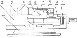 1 - основание, 2 - поворотный корпус, 3 – неподвижная губка, 4 – подвижная губка, 5 – подвижная губка, 7 – гайка, 8 –регулировочный винт, 9 – зажимной винт, 10 – игольчатый подшипник
