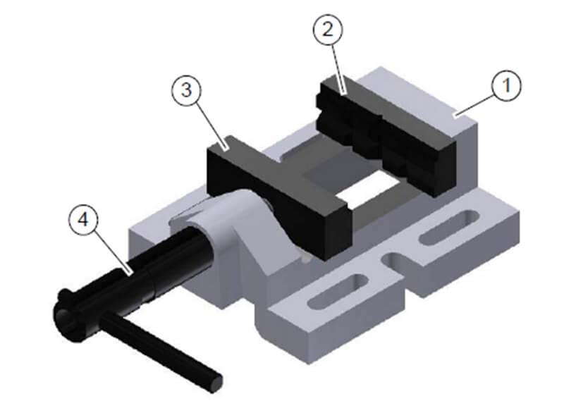 1. Литая чугунная основа, 2. Неподвижная съемная губка с призматическими продольными и поперечными выемками для фиксации цилиндрических заготовок, 3. Подвижная ответная губка. 4. Винтовой вал.
